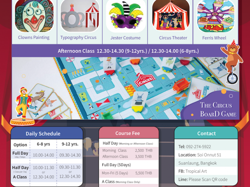 Circus Carnival Art Camp เรียนรู้การสร้างสรรค์ผลงานศิลปะทั้งเพ้นทืและคราฟท์ ที่ขนขบวนความสนุกมาเสริฟ์น้องๆทุกวัน กับธีมศิลปะคณะละครสัตว์ ที่อัดแน่นไปด้วย สีสัน ความสดใสในทุกๆงาน และกิจกรรมพิเศษ!! ในช่วงบ่ายของทุกวัน จะเป็น Mini Project ที่น้องๆ จะได้ลงมือออกแบบ Board Game ด้วยตนเอง เรียนสนุกได้ความรู้ แถมผลงานที่ทำนั้นยังสามารถนำไปเล่นสนุกที่บ้านต่อได้อีกด้วย